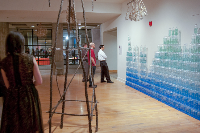 The water bottles are stacked to form a graph of the water levels at Hoover Dam from 1937 to the present--now in drought phase