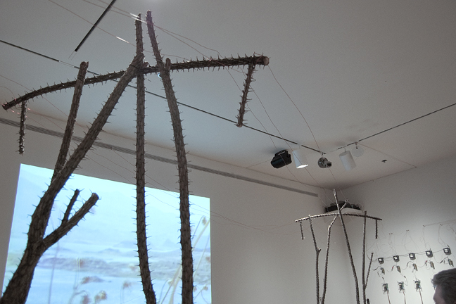 Closeup of magnet wire being carried by ocotillo transmission towers with the audio feed to desert plants wired as loudspcakers.